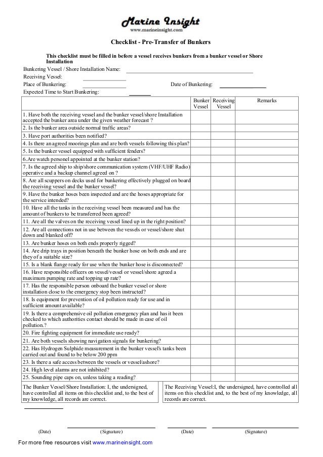 Example bunker checklist